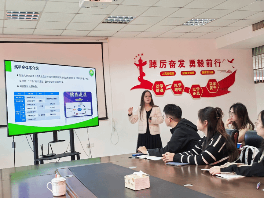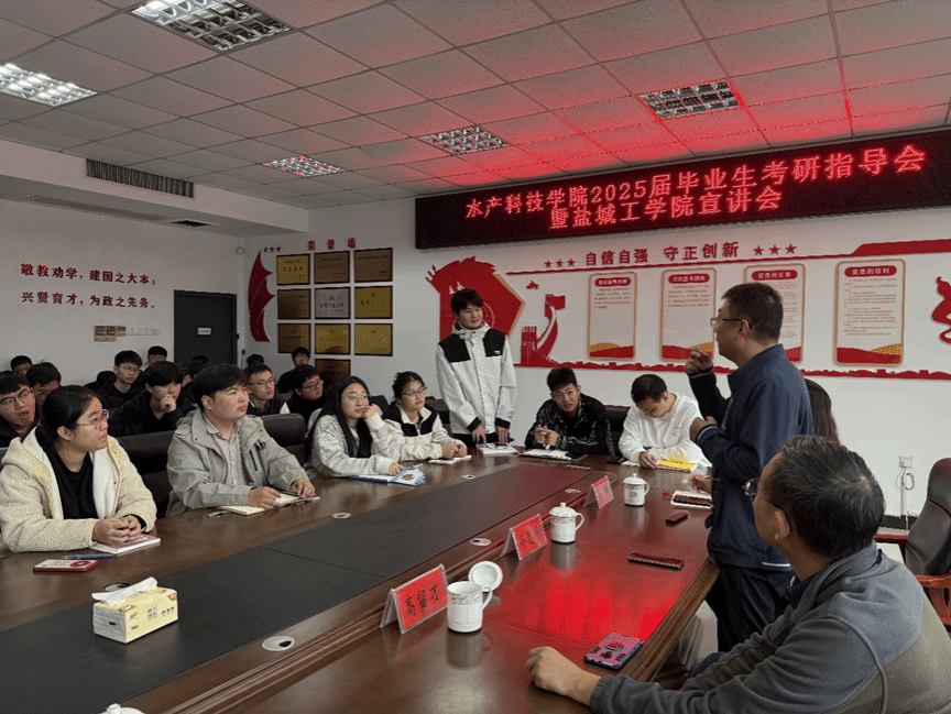 研究生招生宣讲会在江苏农牧水产科技学院实训楼313会议室召开,会议由水产科技学院院长王权主持,办公室主任王建国、团总支书记刘颖及21级水产养殖学(4+0)学生参会。