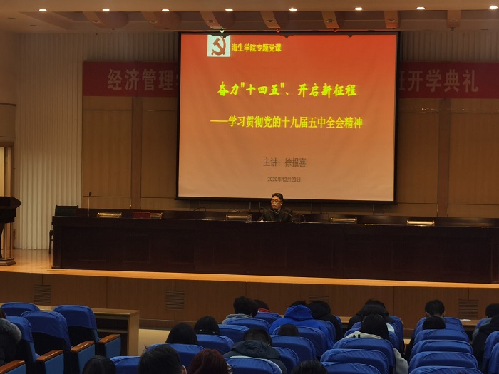 徐报喜围绕学习贯彻党的十九届五中全会精神,介绍了我国社会经济大环境以及在世界经济中所处的地位,讲述了我国在“扎实做好稳就业、稳金融、稳外贸、稳外资、稳投资、稳预期工作,全面落实保居民就业、保基本民生、保市场主体、保粮食能源安全、保产业链供应链稳定、保基层运转任务”的“六稳六保”下,全国一心、众志成城,努力克服新冠肺炎疫情带来的不利影响,有效保障了疫情下我国经济平稳健康运行,进一步坚定了人民群众的制度自信。他以自身经历讲述了我国的“脱贫”成果。他强调,在“十三五”规划的引领下,我国经济社会快速发展,实现了精神和物质的“双脱贫”;2021年是“十四五”开局之年,面对国际国内新形势,我国将坚持把握新发展阶段、践行新发展理念、构建新发展格局,谱写新时期的辉煌篇章。他鼓励同学们要有远大抱负,也要脚踏实地,尽快适应大学生活,提高自身素质,乘着“十四五”的快车,奔向美好未来!