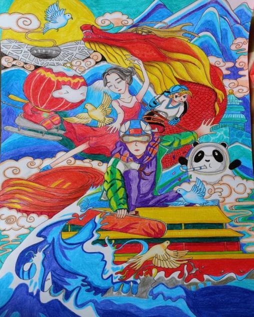 绘画作品精彩层出,缤纷的色彩,独特的构思,刻画出一幕幕冬奥印像。B食品192班的祝晨用水彩描绘了在世界舞台上初露锋芒的冬奥00后的选手们,展现了新时代青年的担当。Z食品191班的王艳潇用彩铅临摹了《激情冬奥》一图,中国龙和海浪分别体现出中华民族团结勇敢,一往无前的精神,中奥运健儿在各个赛事上的缩影,冰墩墩和雪容融集聚一堂助力奥运。B海洋213郁傲男用手抄报的形式,展现了本次冬奥会中国作为东道主的更快、更高、更强、更团结的奥林匹克格言的中国方案。