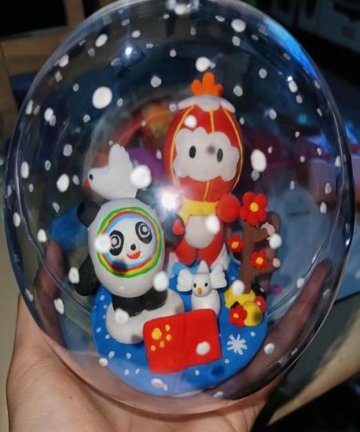 手工作品也充满创意,同学们用超清黏土、橡皮、废旧材料等创作了冬奥会主题的手工作品。周俊秀同学用塑料瓶等废旧材料依照环保、绿色的创作理念制作了《共赴冰雪冬奥》手工作品,对于冬奥会他感慨颇深,他说:“虽然不能到比赛的现场,但我们能积极为祖国宣传,在电视机前为国家的奥运健儿喝彩。”黄梦欣同学用超轻黏土捏出形态各异的冰墩墩,它们或微笑,或睁大双眼,一个个憨厚可爱,有趣极了。五个冰墩墩,寓意着奥运五环,也象征着奥运精神。