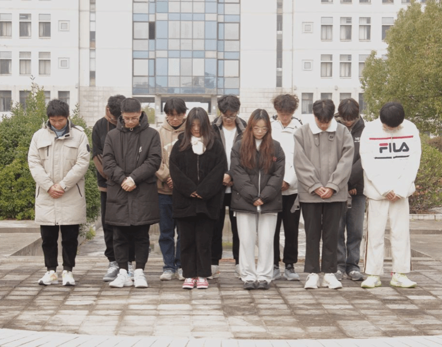 最后,大家带着沉重的心情走到国旗下,进入今天活动的最后一个部分——国旗下默哀。全体成员低头默哀三分钟,缅怀先辈们的革命精神,向逝者致以最崇高的敬意。