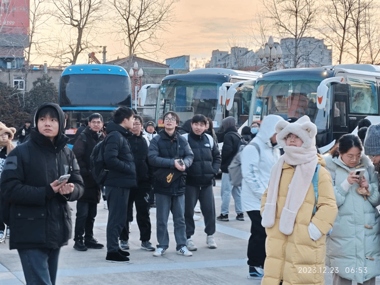 踏着晨雾,直面严寒,考研的同学有序上车。伴随着车上同学最后的看书备考与老师的殷殷嘱托,一辆辆满载希望的大巴车缓缓驶向各自考点。