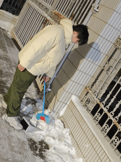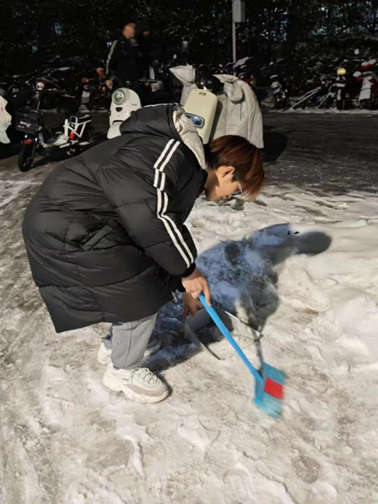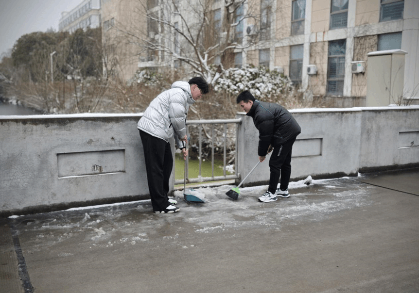 参加本次志愿活动的B海洋213班孙家孝同学说道:“刚到学校就欣赏到了我们盐工别样的美,但是发现校园道路上的积雪混合雨水致使道路结冰,非常危险,就发动身边的同学们一起帮忙,清扫道路积雪。”王施雄同学说:“路面结冰打滑,大家走路都是小心翼翼,开学人流量很大,就想着能清一片是一片,大家出行都安全点”。