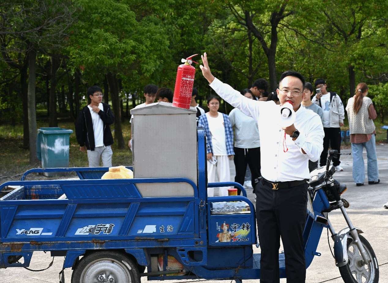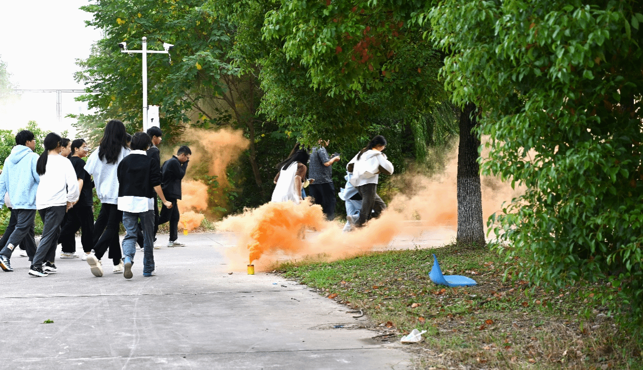 在互动环节,陆亮点燃火盆,让新生们亲自尝试使用灭火器进行灭火操作,这一实践环节极大地激发了同学们的学习热情,也让他们在实践中加深了对灭火器使用方法的掌握。紧接着,通过点燃烟雾弹模拟火灾烟雾,在老师们的引导下,新生们迅速而有序地撤离现场,体验了火灾逃生时的紧张与冷静应对。