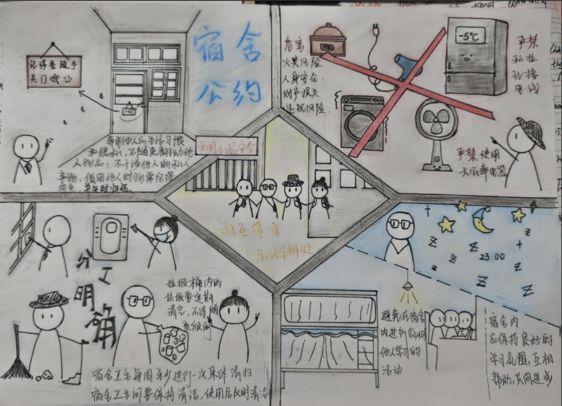 “文明卫生寝室”活动通过不定时抽查、评审小组匿名评分的形式,从寝室卫生、寝室用电安全、寝室文化氛围等方面综合评价;“寝室公约”设计大赛中的一幅幅作品,是同学们对寝室文明的正确理解,更是同学们丰富想象力的体现,通过自己灵巧的双手,以艺术海报的呈现出来;“宿舍安全我来说”视频大赛更是能够通过学生的视角来拍摄视频,普及寝室安全知识,提高自我保护能力。