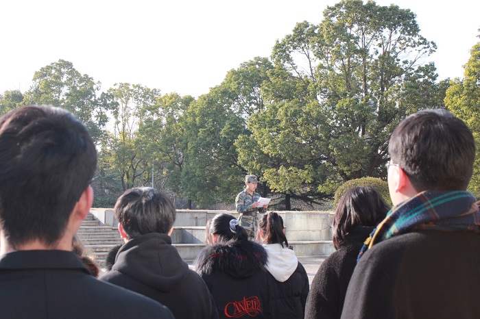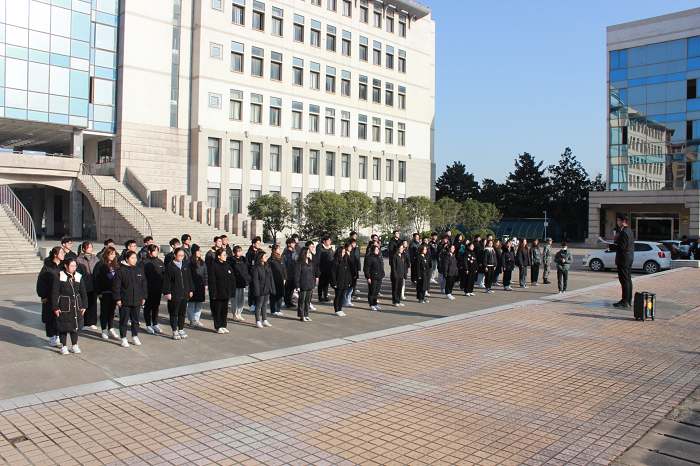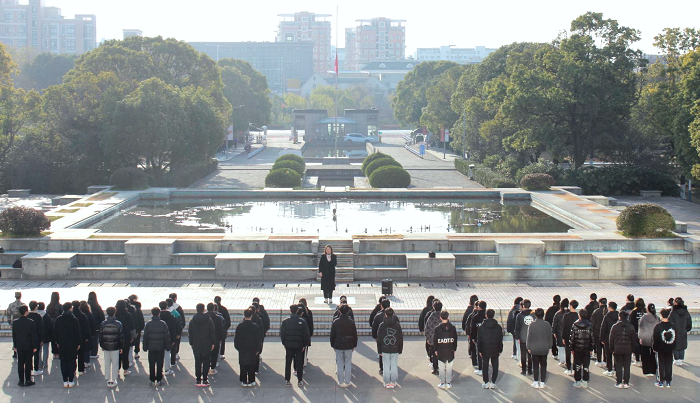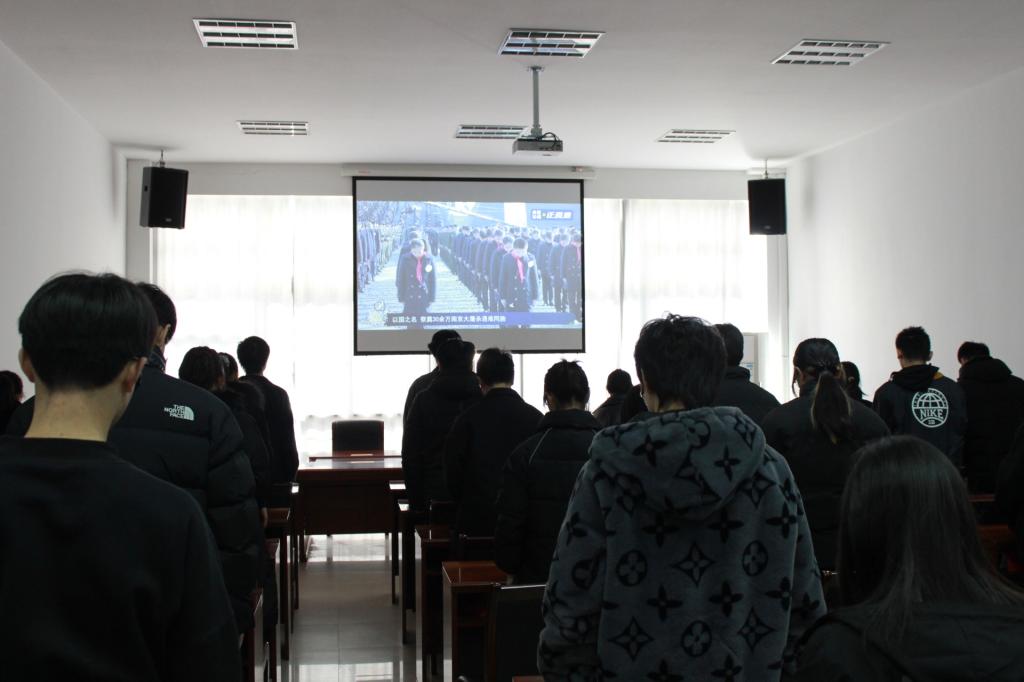 八点半,参加活动的60余名同学站成方阵,面向五星红旗齐声共唱国歌,喊出充满斗志的壮烈口号“以史为鉴,开创未来。铭记历史,强国有我。”海鲨特战旅退伍军人,B生物191班的张阔发言,她结合自己在部队的生活,回顾革命前辈们的艰苦奋斗,呼吁同学们要不怕困难,自信自强。2021级新生房冠辰同学代表发言,他表示真切地感受到历史的沉痛,但更为祖国今日的强大而自豪。作为大一新生,同学们应该努力学习,增强本领,创造未来。学生集中在体育馆,在黑暗中用手机闪光灯拼凑出12.13日期符号,祭奠遇难同胞,缅怀革命先烈。学生们还在学院会议室观看了国家公祭日的直播。直播结束后,学生们全体起立,向遇难同胞默哀。B海洋202的陈诗豪说道:“参与这次活动,我意识到国家公祭日绝不仅仅是为了发思古之幽情,我们更应该吸取历史教训,居安思危,痛定思痛,知耻后勇,刻苦学习。我作为学生干部,更要响应习近平总书记对中国青年“立大志、明大德、成大才、担大任”的号召。”