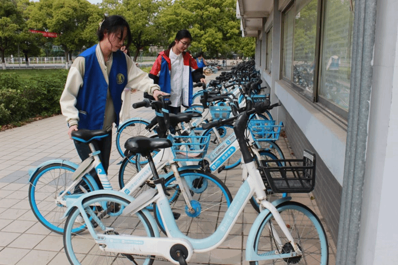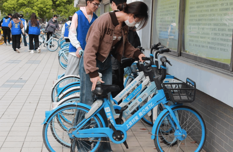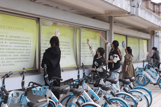 同学们相互合作,合理分工,积极配合,将凌乱与倒在地上的自行车扶正摆齐,将摆放乱停乱放的共享单车到规定位置,同时向行人宣传“文明出行,规范停放”的理念;他们细心拾起车筐里的垃圾,忙碌的身影穿梭在各个自行车停放点,身上的蓝马甲与胸前的徽章格外亮眼,成了春季校园里一抹亮丽的风景!