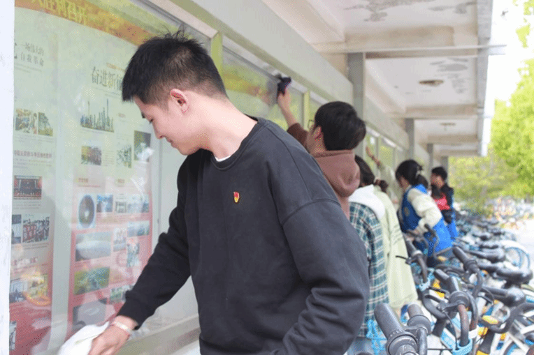 学生身穿蓝色志愿者马甲,对宣传栏进行清理与维护,在阳光的照耀下更显青春与活力,大家分工明确,各司其职,打水,清扫,擦橱窗,滴滴汗珠点缀着同学们奋力的姿态……虽是校园一角,却在他们的努力下焕然一新,他们默默奉献亦留下了最可爱的身影!