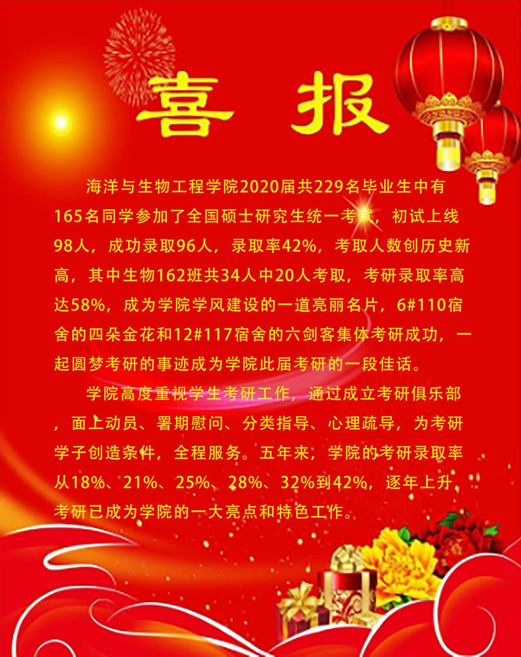 英国正版365官方网站2020届共229名毕业生中有165名同学参加了全国硕士研究生统一考试,初试上线98人,成功录取96人,录取率42%,考取人数创历史新高,其中生物162班共34人中20人考取,考研录取率高达58%,成为学院学风建设的一道亮丽名片,6#110宿舍的四朵金花和12#117宿舍的六剑客集体考研成功,一起圆梦考研的事迹成为学院此届考研的一段佳话。 学院高度重视学生考研工作,通过成立考研俱乐部,面上动员、署期慰问、分类指导、心理疏导,为考研学子创造条件,全程服务。五年来,学院的考研录取率从18%、21%、25%、28%、32%到42%,逐年上升,考研已成为学院的一大亮点和特色工作。