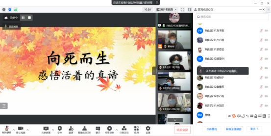 B生物211的曹昱在体验模拟生死的游戏中说,“如果真的末日来临,我会划掉我自己,我真的不舍得我任何一个至亲。”在这场游戏中,大家围成一个圈,每个人在纸上写下6个的名字,然后模拟自己的岁月场景,一一划去一个名字,直到只剩下最后一个名字。随着一个个名字被划掉,现场越来越安静。B海洋211的金颖说:“最后一位我留的是我的妈妈,她从没有错过我的人生的任何阶段。现实很残酷,我明白生离死别是我们每个人必然会经历的事情。不管我们多么不舍,这些深爱我们的亲人终究会离我们而去。”在模拟生死中,方知光阴的宝贵、身边人的可爱。