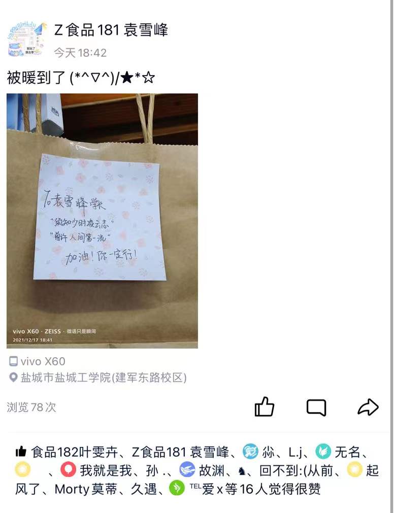 会后,B海洋181班宋志伟同学说,学院的关怀很及时,老师们的提醒很贴心,考研“加油包”很暖心。Z食品181班袁雪峰同学更是在QQ空间中发布“被暖到了”的说说,收到多人点赞。