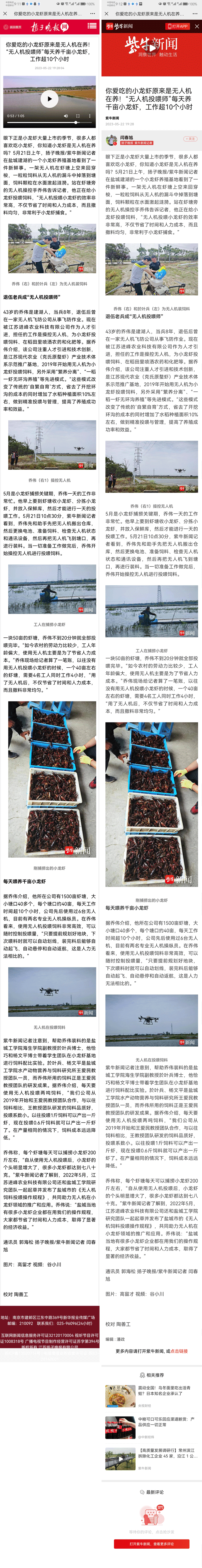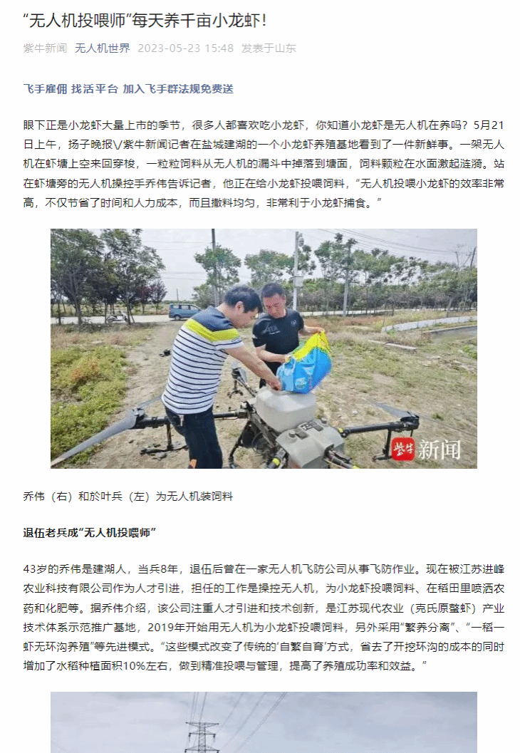 眼下正是小龙虾大量上市的季节,很多人都喜欢吃小龙虾,你知道小龙虾是无人机在养吗?5月21日上午,扬子晚报\/紫牛新闻记者在盐城建湖的一个小龙虾养殖基地看到了一件新鲜事。一架无人机在虾塘上空来回穿梭,一粒粒饲料从无人机的漏斗中掉落到塘面,饲料颗粒在水面激起涟漪。站在虾塘旁的无人机操控手乔伟告诉记者,他正在给小龙虾投喂饲料,“无人机投喂小龙虾的效率非常高,不仅节省了时间和人力成本,而且撒料均匀,非常利于小龙虾捕食。”