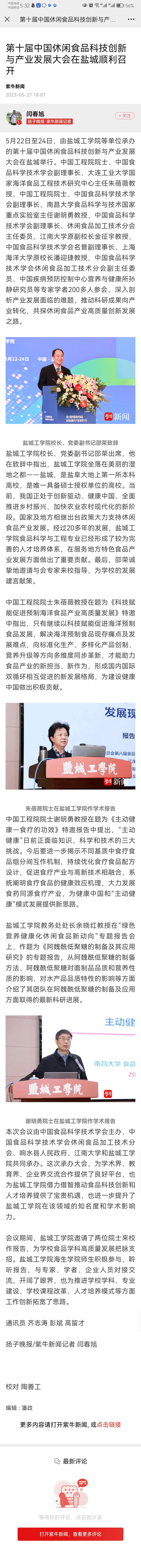5月22日至24日,由盐城工学院等单位承办的第十届中国休闲食品科技创新与产业发展大会在盐城举行。中国工程院院士、中国食品科学技术学会副理事长、大连工业大学国家海洋食品工程技术研究中心主任朱蓓薇教授,中国工程院院士、中国食品科学技术学会副理事长、南昌大学食品科学与技术国家重点实验室主任谢明勇教授,中国食品科学技术学会副理事长、休闲食品加工技术分会主任委员、江南大学原副校长金征宇教授,中国食品科学技术学会名誉副理事长、上海海洋大学原校长潘迎捷教授,中国食品科学技术学会休闲食品加工技术分会副主任委员、中国疾病预防控制中心营养与健康所孙静研究员等专家学者200多人参会,深入剖析产业发展面临的难题,推动科研成果向产业转化,共探休闲食品产业高质量创新发展之路。